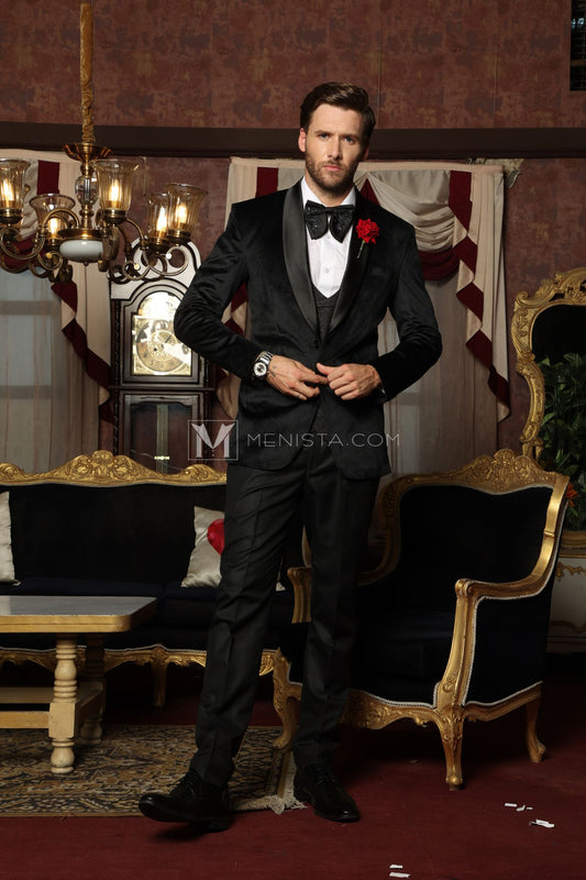 Luxurious Velvet Black Suit for Men with Rose Lapel Pin – Ideal for Weddings and Special Events | Menista